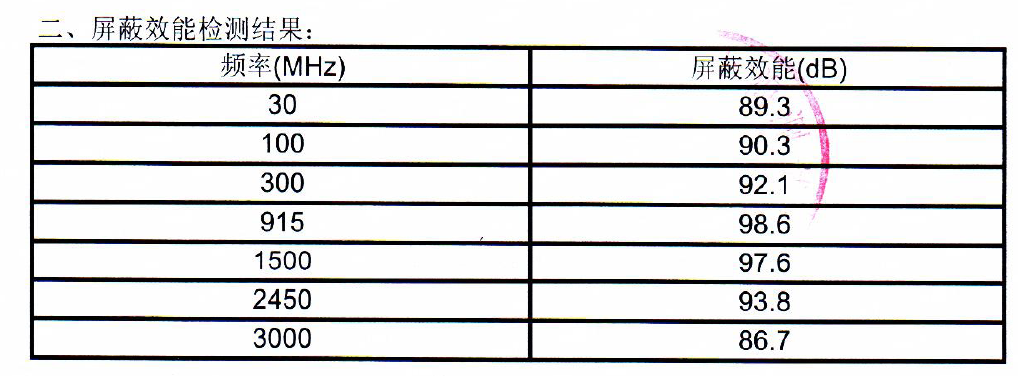 采用高端鋁箔屏蔽材料加上PVC材料與暗扣或者魔術貼生產,鋁箔的連續結構會比網狀屏蔽結構效果更佳,經檢測機構檢測,屏蔽效果如下圖: